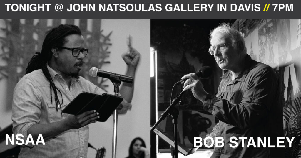 Our October 2nd, Poetry Night will feature the poets Lawrence Dinkins and Bob Stanley. We meet at 7 PM inside the John Natsoulas Gallery at 521 1st Street in Davis, and we hope you can join us!